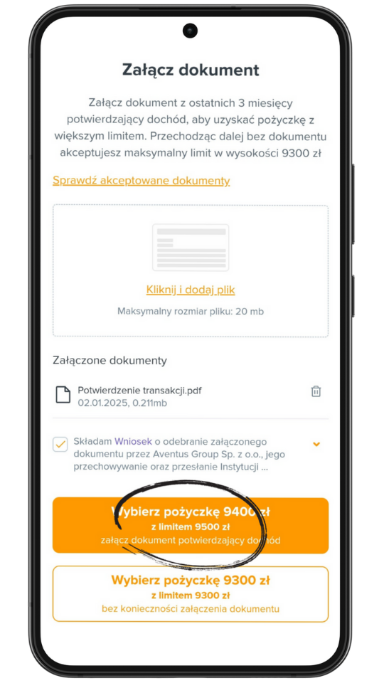 UWAGA! Dokumenty potwierdzające wysokość Twoich dochodów możesz załączyć jeszcze przed złożeniem wniosku o pożyczkę w wyższej kwocie, dzięki czemu w przyszłości proces aplikacji przebiegnie sprawniej. Możesz to zrobić logując się do swojego profilu w strefie klienta i wchodząc w zakładkę “Dane osobowe”. Dodanie dokumentu jest bardzo proste zarówno na telefonie, jak i na komputerze.